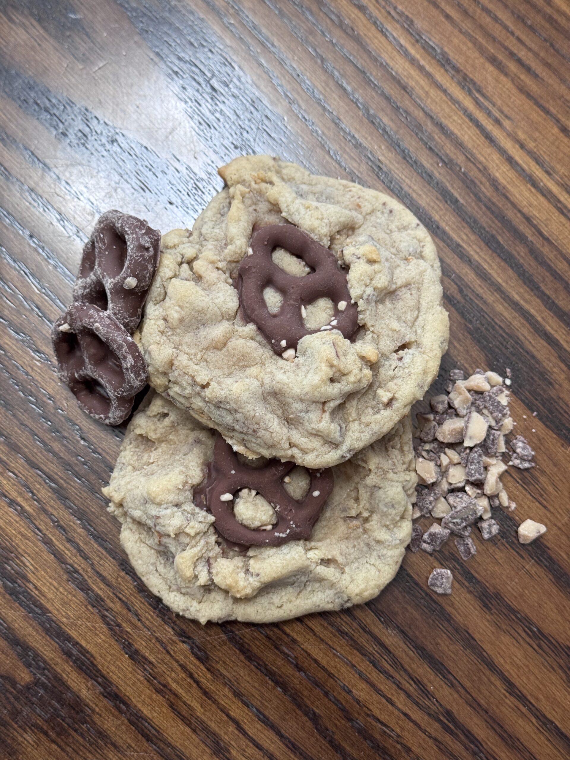 Traditional dough tossed with chunks of toffee and chocolate covered pretzels